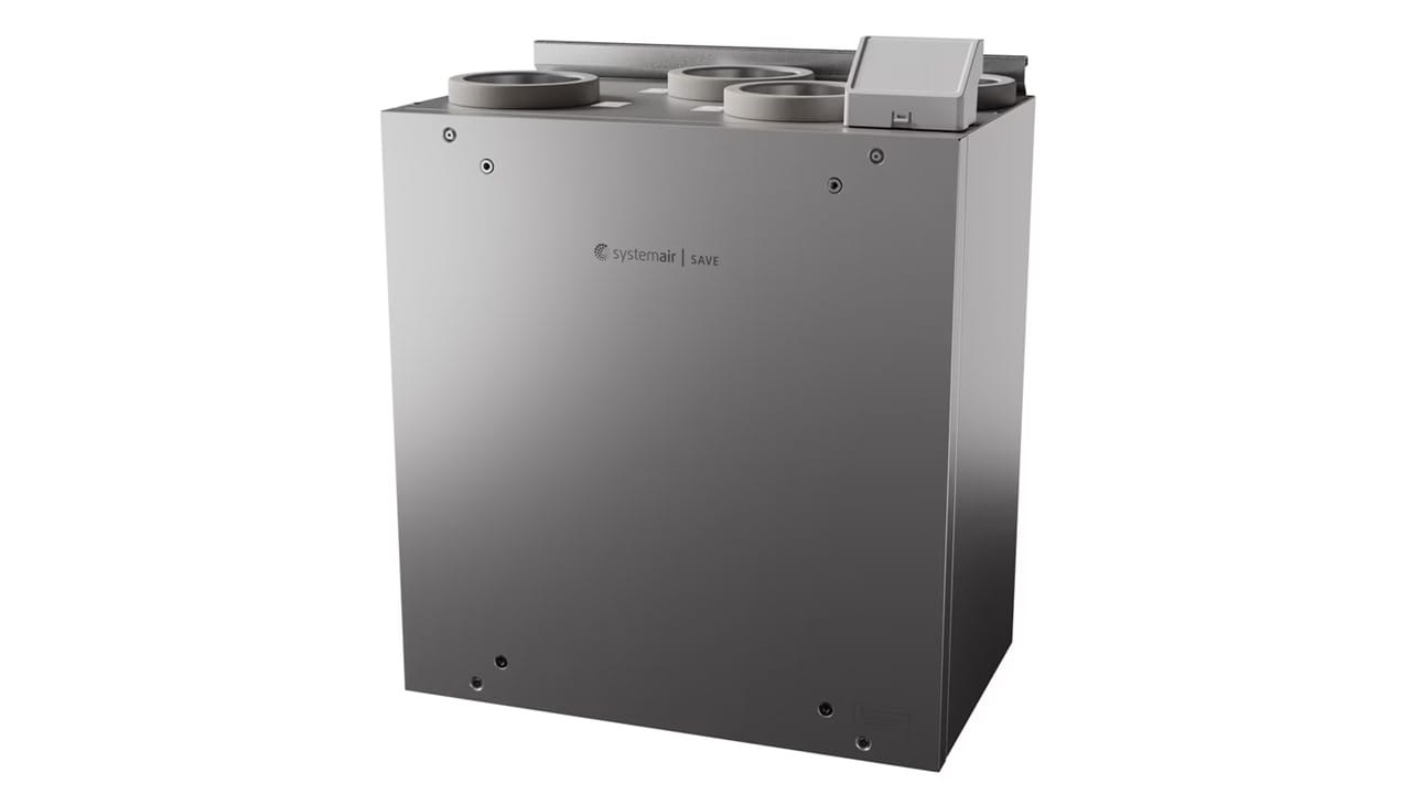 Systemair SAVE VTR 150/B L er et moderne ventilasjonsaggregat med roterende varmegjenvinning, integrert by-pass og toppanslutning (venstre).