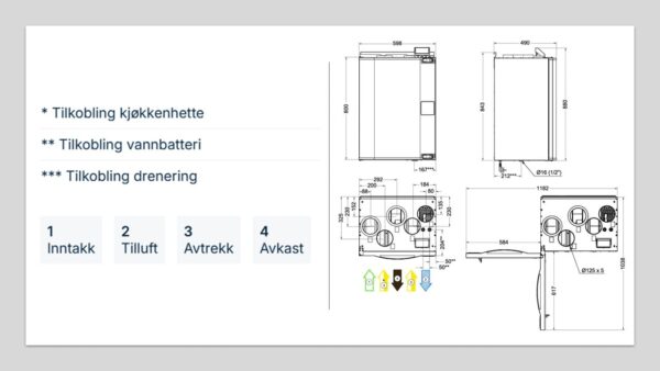 Ventilasjonsaggregatet har en utvendig tilkoblingsboks med innganger og utganger for enkel installasjon og oppsett av eksterne følere, samt evt. eksterne varme- og kjølebatteri. Leveres med støpsel for jordet stikkontakt.